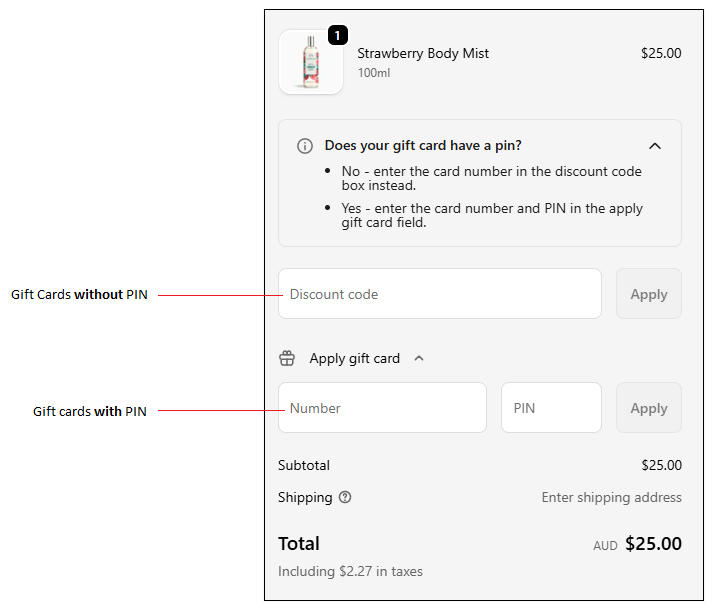 Enter the card number in the Discount Code box at checkout.If your gift card has a PIN: